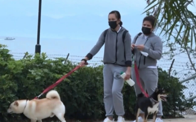 关之琳散步运动时,两个保姆一人牵着一只狗,在一旁专门负责遛狗。