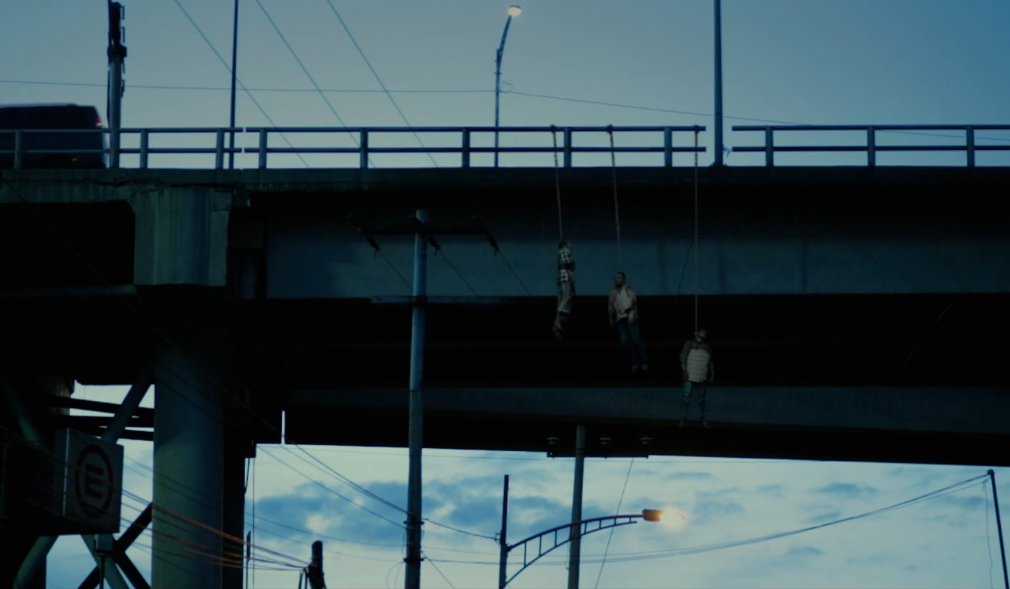 毒贩们将对手的尸体吊在立交桥上,随着往来车辆引起的震动不断摇摆、碰撞;