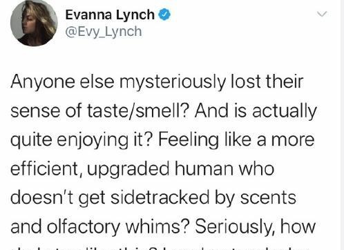 林奇连发了两条状态,第一条写道:“有没有人跟我一样神奇地失去味觉了?而且还有点享受这种感觉?没有味觉和嗅觉的干扰,感觉自己进化成了更高效的升级人类。真的,我能继续保持这种状态吗?终于懂了为什么说机器人将统治未来了。”