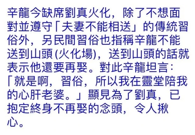 报道称,民间习俗指若丈夫送妻子到“山头”(火化场),就表示丈夫会再娶,而辛龙坦言自己只会在会馆陪伴心肝老婆,可见辛龙已经抱定了终身不再娶的念头。