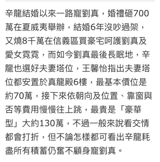 从辛龙花700万台币(约165万人民币)在夏威夷办豪华婚礼娶刘真,婚后又豪掷8000万台币(约1900万人民币)筑爱巢就可知他有多宠爱妻子。