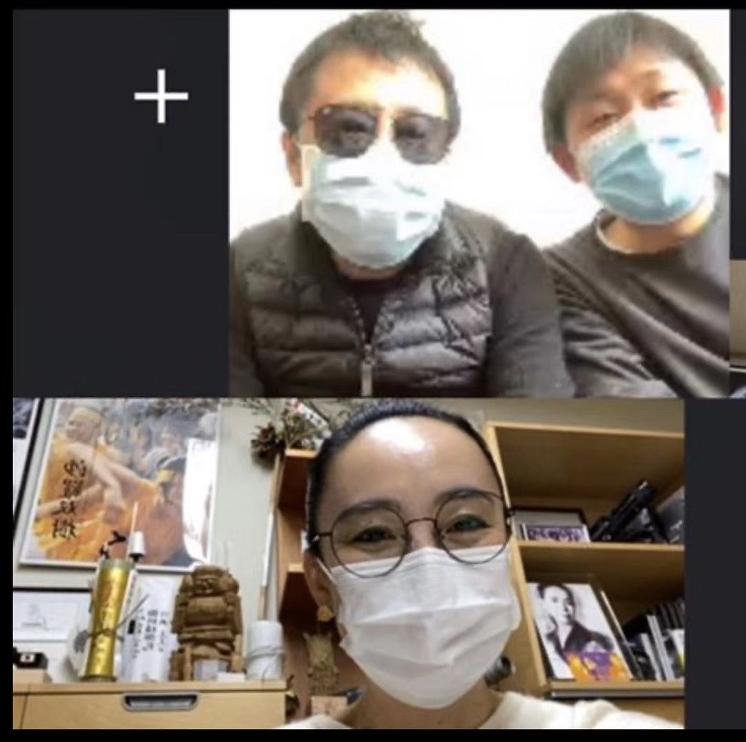导演鹏飞和两位监制贾樟柯与河濑直美在线上沟通影片《又见奈良》的制作。