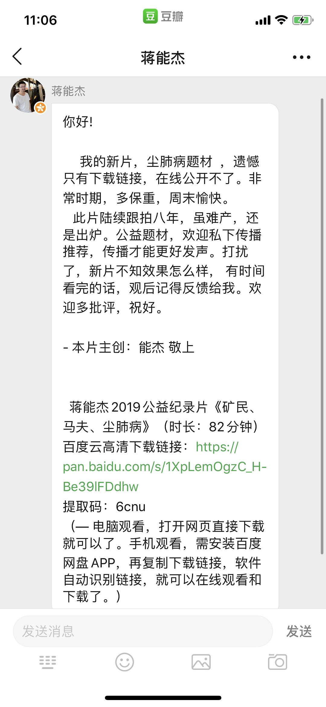 独立电影人蒋能杰给网友私信