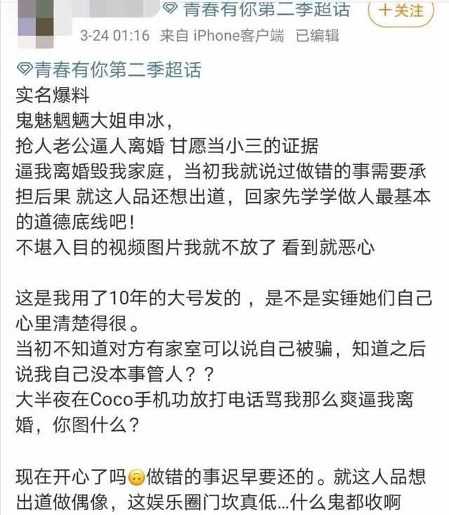 一位昵称为Masskiiiii的在社交平台上爆料,称申冰在她怀孕坐月子期间,插足她的婚姻,还不断打电话发信息骚扰她,让对方妥协离婚。