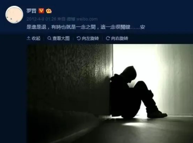 2012年,罗晋和唐嫣在拍完《乱世佳人》后,罗晋于凌晨1点26分在社交平台上发问:是进是退,有时也就是一念之间,这一念很关键……