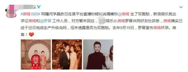 在此之前,演员闫学晶直播时曾意外说漏嘴,爆出唐嫣已经诞下双胞胎,但时至今日,唐嫣、罗晋二人并未做出明确回应。