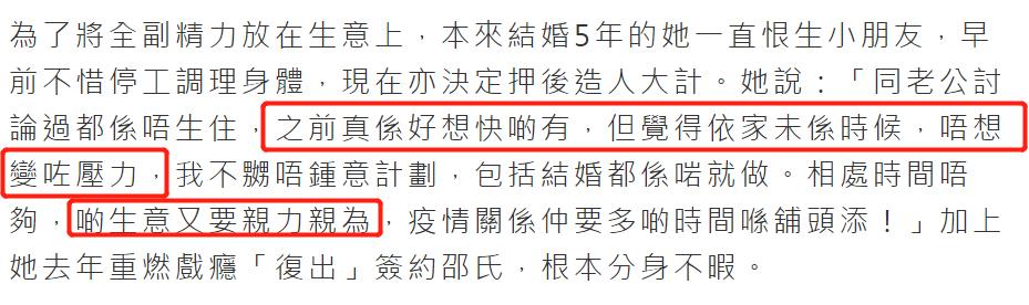 为了将全部精力都放在生意上,结婚5年的她原本迫切想要生宝宝,早前更是停工调养身体,不过现在打算暂时延缓造人计划,她坦言和老公商量后,都觉得现在不到时候,不想增加别的压力,加上去年复出签约了邵氏,又要忙于生意的她分身乏术。
