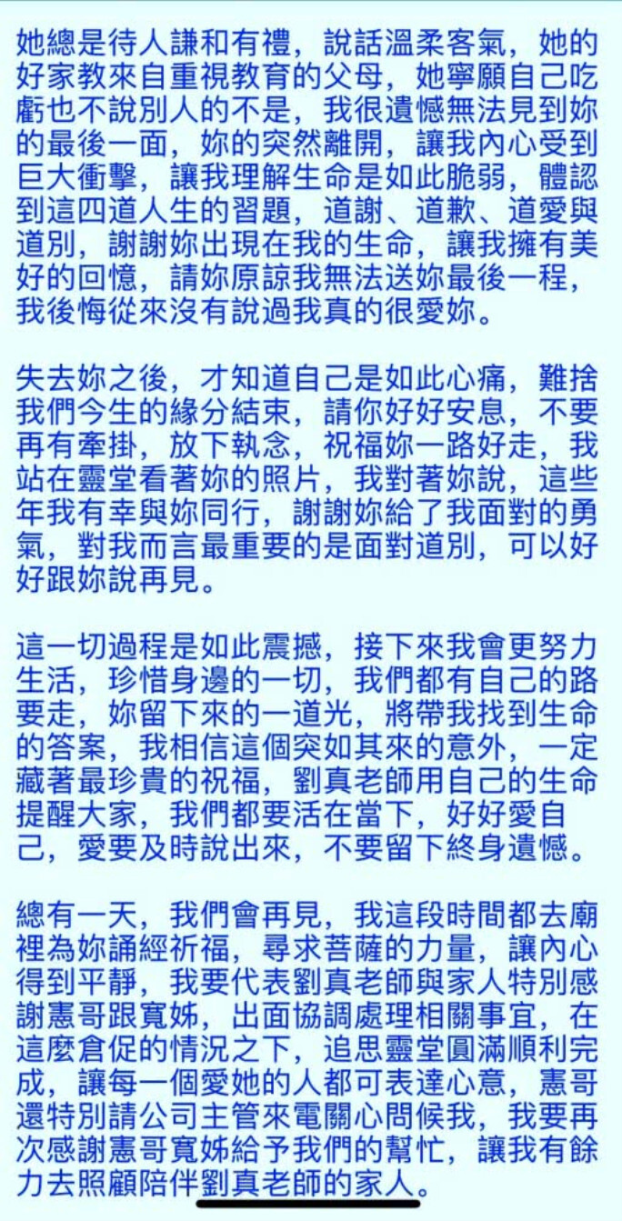 3月30日,刘真生前的经纪人任月琴发长文向刘真告别,据悉,二人已合作十年之久,情同姐妹,任月琴将在文章中回忆了二人相处的生活点滴,言语真挚感人,让人泪以下是任月琴写的道别信全文:638微信扫一扫复制下方链接,去粘贴给好友吧-经纪人发长文哭别刘真:你是生命最美的遇见!二人合作十年情同姐妹复制链接本文由网络整理 © 版权归原作者所有