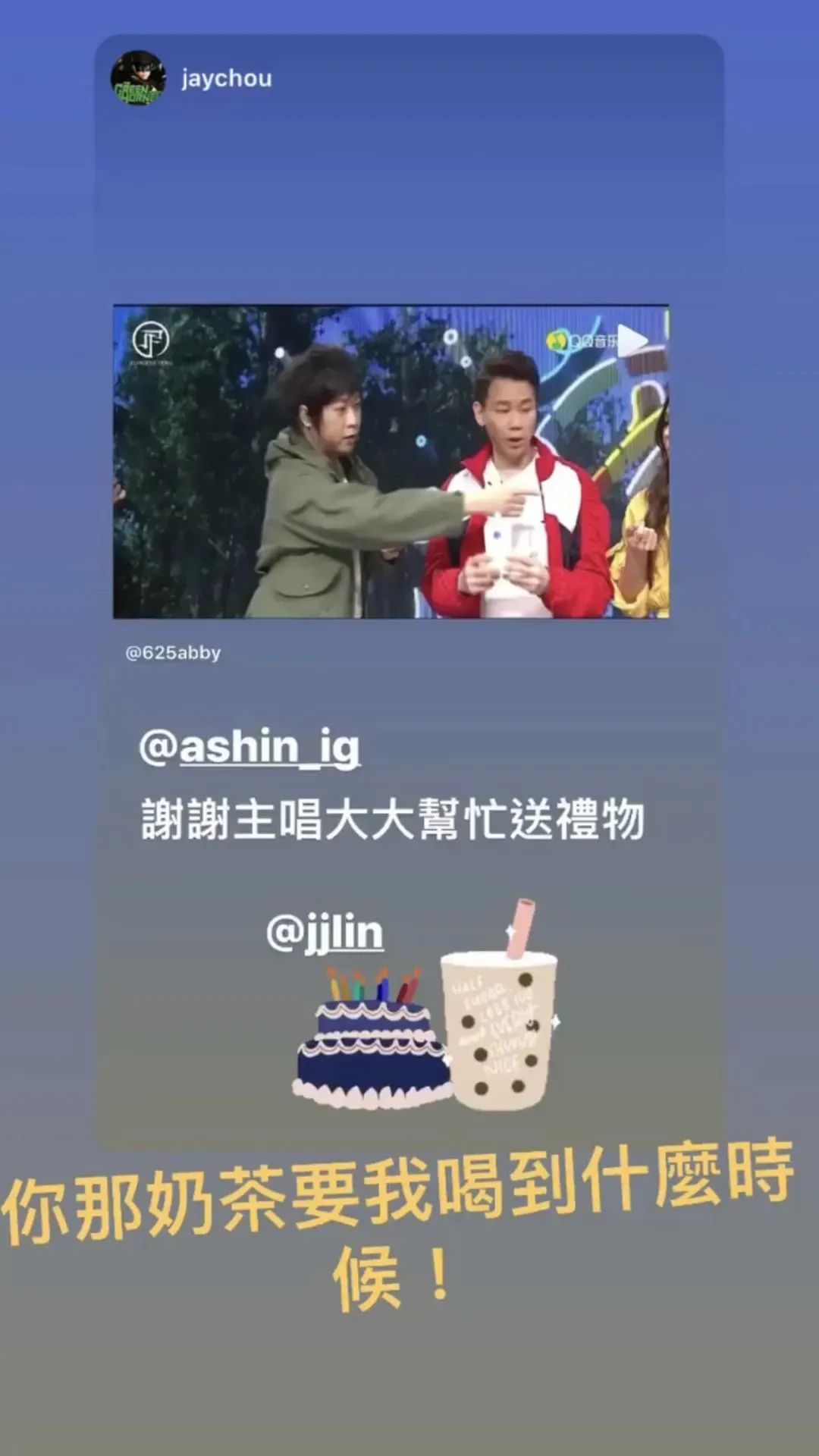 生日会直播结束后,奶茶魔鬼周杰伦还发动态回应说:谢谢主唱大大帮忙送礼物,顺便还让阿信在直播中给林俊杰带话,让他一会儿喝完后,拍下照片发ins给他看