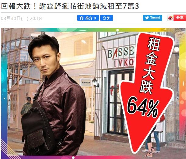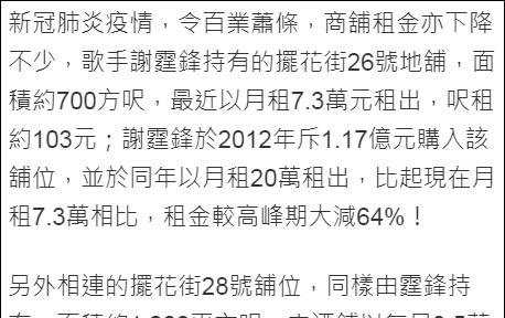 据了解,谢霆锋于2012年斥资1.17亿港元购入香港摆花街26号店铺,购入面积约700平方呎(约65平方米),之后每月以20万港元租出,不过到了今年,租金已降至7.3万港元。