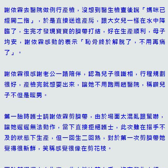 谢依霖第一次生产时,浴缸被染红了一片,但第二次生产因为有规划,所以相对轻松,没有第一胎出血严重。