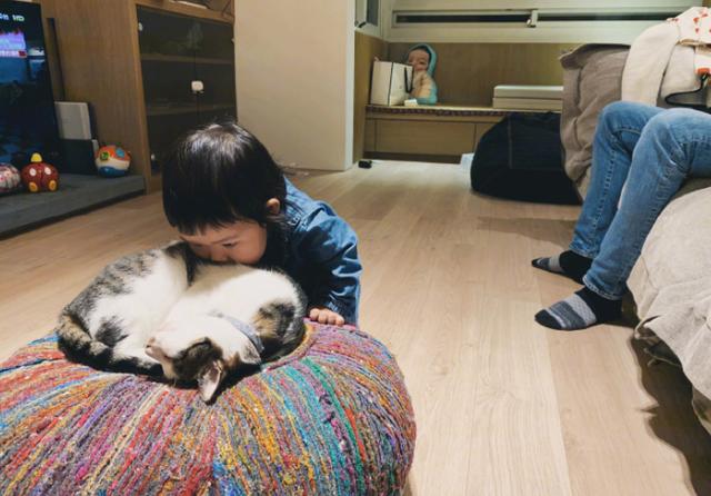 不过照片中并未出现大女儿的身影,仅是猫咪陪她们母子出镜,照片中二宝侧躺熟睡,他穿着白色婴儿装,头发浓密白白胖胖非常健康。