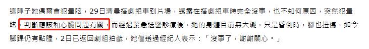 张琼姿突然头晕不是没有原因的,极大可能与她的心脏问题有关。她患有心脏二尖瓣膜脱垂,这种病轻则引起心悸胸闷、呼吸困难等等症状,但太严重也会对身体造成极大影响。去年张琼姿做过相关手术,虽不需要住院,但她仍要注意保养,吃药控制,而这段时间她偶尔会头晕,只是没当回事,没想到会突然导致踩空晕倒。