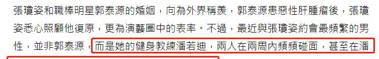 郭泰源患有肝癌时,张琼姿不离不弃照顾他,直到他复原,然而2003年却传出张琼姿与她的健身教练频频约见,甚至躲在车内拉起挡板密会超过80分钟,引出轨传闻。