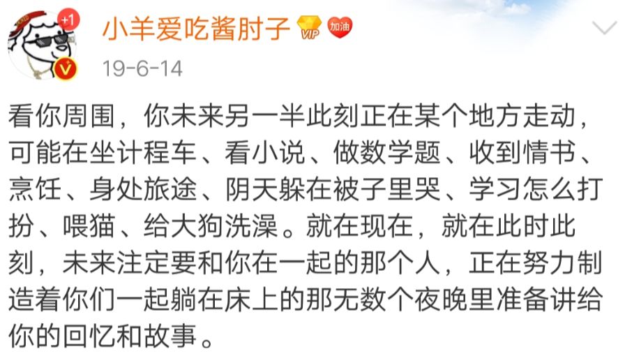 “就在现在,就在此时此刻,未来注定和你在一起的那个人,正在努力制造着你们一起躺在床上的那无数个夜晚里准备讲给你的回忆和故事”。