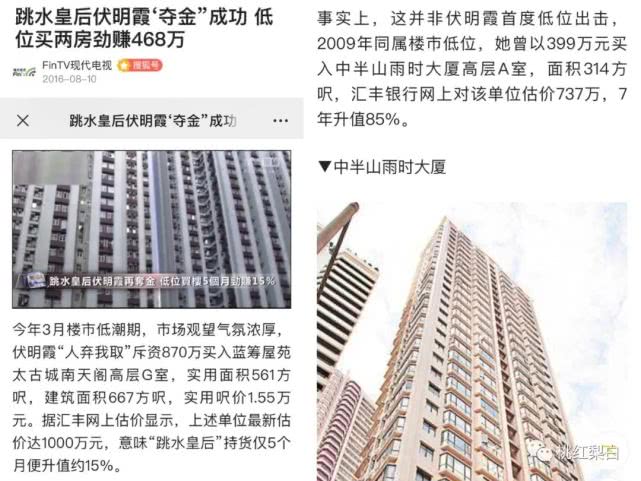 光这两处住宅,就已经值5个亿。 2009年楼市低位,伏明霞以399万买入中半山雨时大厦高层,估价737万,之后7年升值85%。 2016年3月,伏明霞斥资870万,买入太古城南天阁高层,8月估价就达到1000万元,5个月升值约15%。
