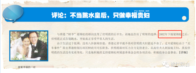 交往近一年后,2002年3月23日,梁锦松承认恋情,宣布一年内迎娶伏明霞。伏明霞也表态:我想我会嫁给他。