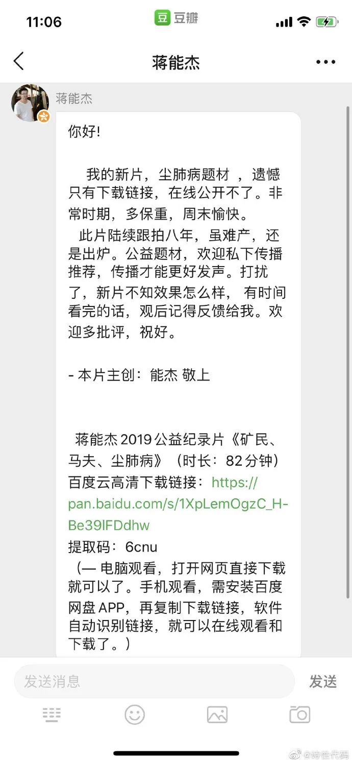 蒋能杰给所有在豆瓣为电影点亮“想看”的网友,逐一发送了高清片源地址,欢迎大家传播。他还诚恳地期待观众对观后感,“打扰了,新片不知道效果怎么样。有时间看完的话,观后记得反馈给我。欢迎多批评,祝好。”