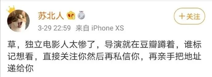 “独立电影人太惨了,导演就在豆瓣蹲着,谁标记想看,直接关注你然后再私信你,再亲手把地址递给你。”