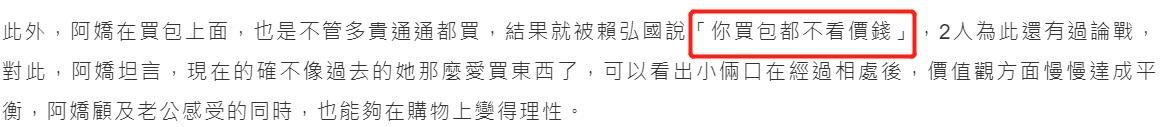 难怪老公赖泓国曾说她"买包不看价钱。"最后再也不敢把卡交给阿娇保管了。咱们有钱也经不起这么造啊!