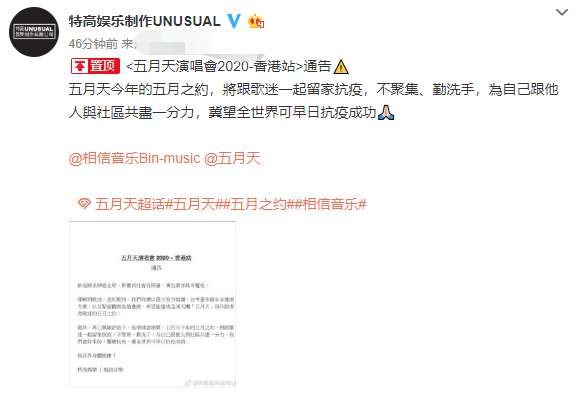 通告里称:“五月天今年的五月之约,将跟歌迷一起留家抗疫,不聚集、勤洗手,为自己跟他人与社会共尽一份力,希望全世界可早日抗疫成功”。