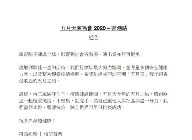 3月31日,受疫情影响,五月天演唱会主办方特高娱乐制作发布通告,宣布2020年五月天香港演唱会取消。
