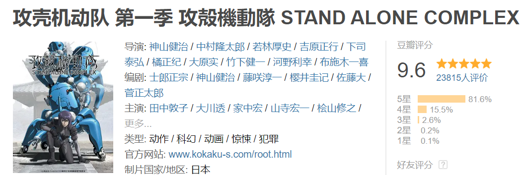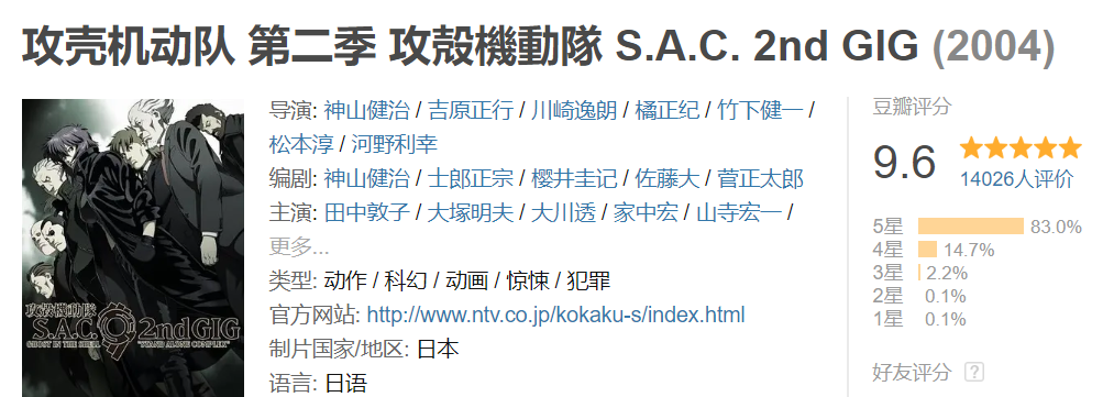 攻壳机动队SAC这个系列,基本就是日本TV动画最高水准的代表作。前两季TV动画无论在哪个动画榜单都能排到TOP3,属于举世公认的“神作”。