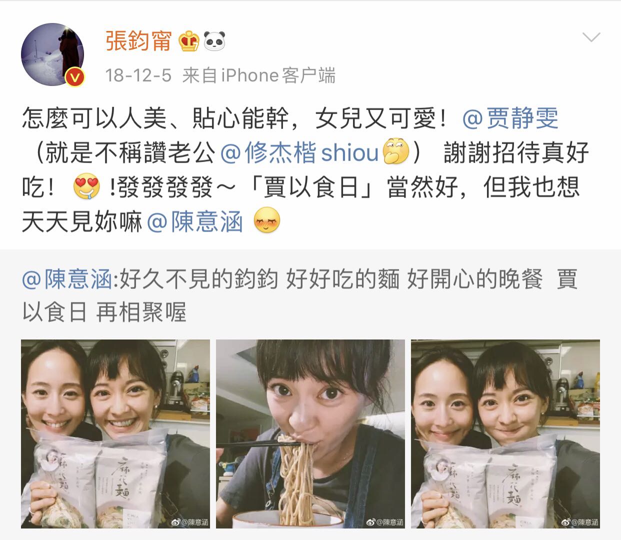 张钧甯和陈意涵在社交媒体上的好情谊,停留在2018年12月5日,当时2人碰面,为了替贾静雯的干拌面宣传,张钧甯tag陈意涵,甜腻地写着“发发发发(陈意涵小名是陈大发)~‘贾以食日’当然好,但我也想天天见你嘛”,反之陈意涵同一天发文8,没有tag张钧甯,而是冷静地写着“好久不见的钧钧 好好吃的面 好开心的晚餐 贾以食日 再相聚喔。”此后一年多,2人如同平行线,再无交集。