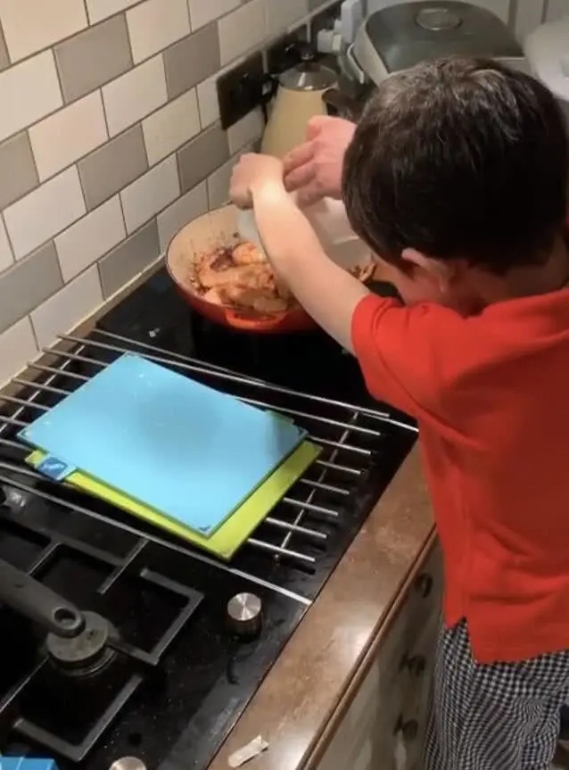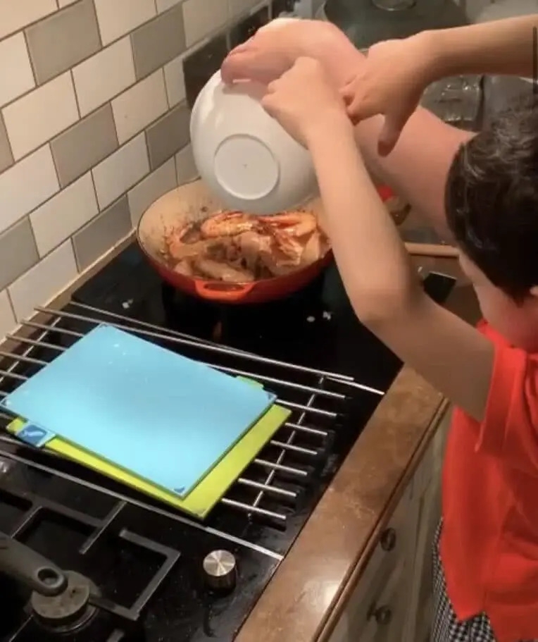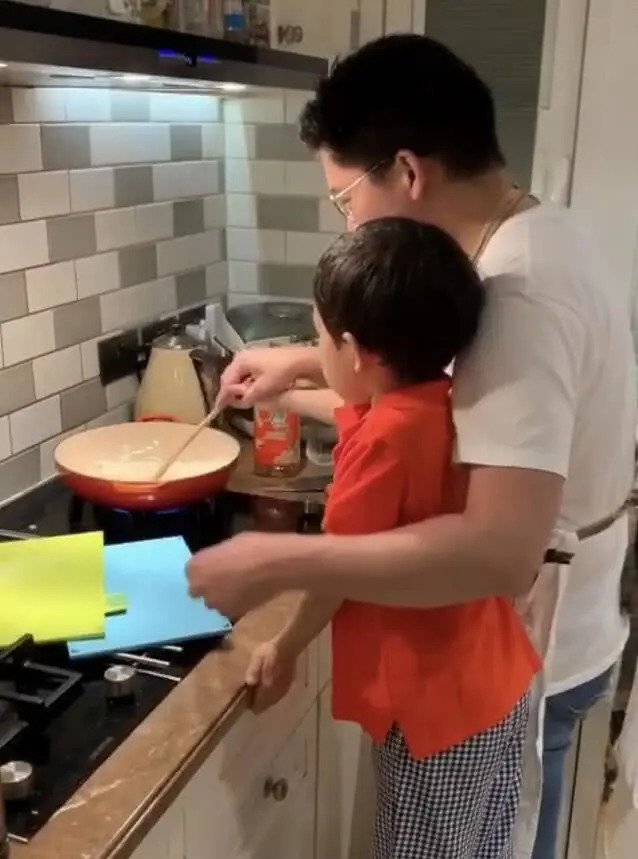 3月30日,霍启刚在个人社交软件分享了自己与大儿子霍中曦一起做虾的画