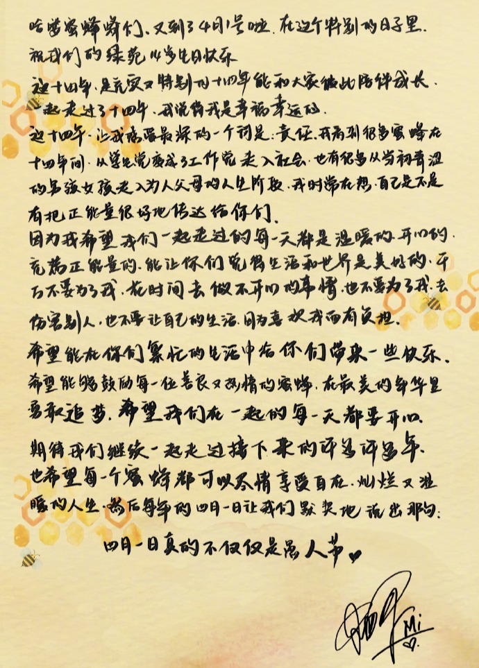 杨幂在信中写道:“这十四年,是充实又特别的十四年,能和大家彼此陪伴成长,一起走过了十四年,我觉得我是幸福幸运的。”