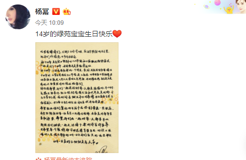 4月1日,杨幂晒出一张手写信庆祝粉丝会成立14周年,并配文:“14岁绿苑宝宝生日快乐”。