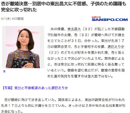 知情人士透露,杏之前因为孩子还有些犹豫,但对东出已经没有信任感,在东出昌大上月谢罪会见之前,就已经找好了律师着手准备离婚事宜。