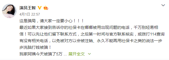 4月1日,曾出演过《夏洛特烦恼》的演员王智在社交动态上发文,称自己家的阿姨遭遇骗局,被骗走了5万块。