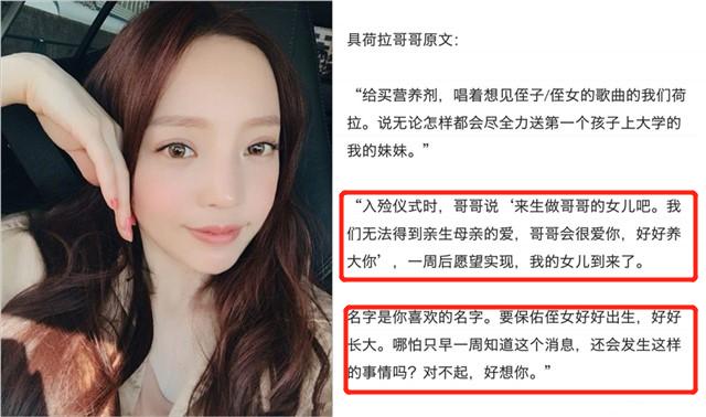 具浩仁发文透露,具荷拉生前非常想要看到哥哥的孩子出世,还给嫂子买营养品,唱着想见到侄子或侄女的歌曲,说无论如何会尽力送孩子上大学。但是还没等见到侄子或侄女出生,具荷拉就离开了人世。