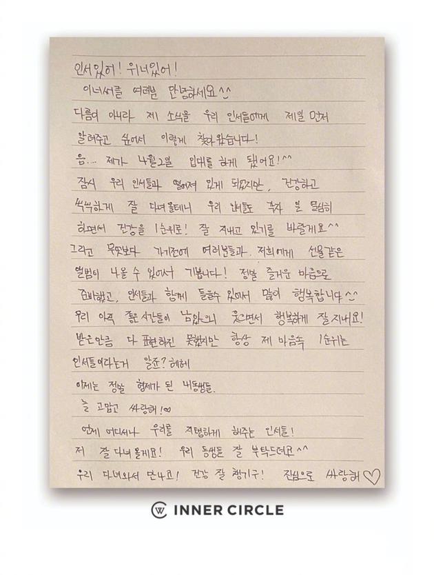 3月27日,WINNER金秦禹通过手写信的形式宣布了4月2日入伍的消息,表示“想最先告诉我们Inner Circle,4月2日要入伍了。”