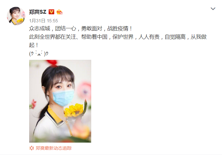 而郑爽也数次在社交媒体上向抗疫前线的工作者表示敬意。同时,也号召大众自觉隔离,团结一心,共同抗疫。