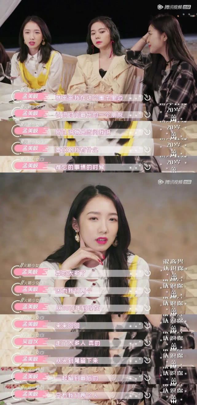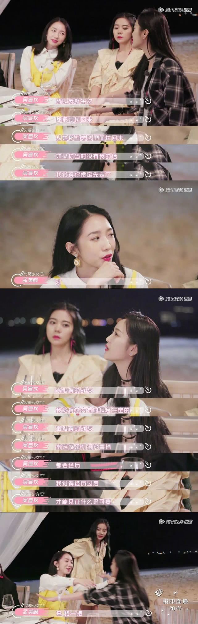 在沙滩晚餐环节,吴宣仪问火箭少女们和她在一起发生过最难忘的事情,孟美岐趁着酒劲表白吴宣仪,感谢多年的陪伴。