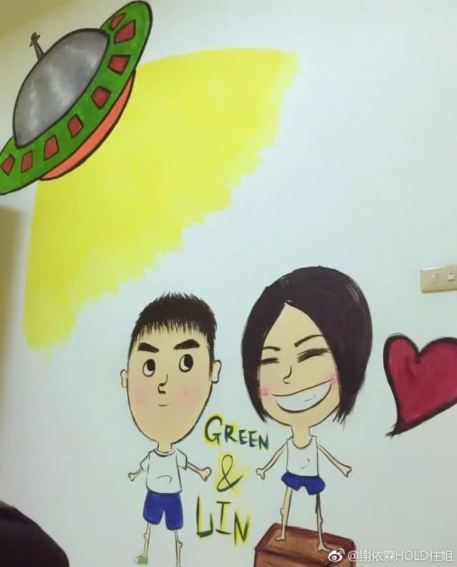 在谢依霖晒出的图片中,可以看到两人都是Q版形象。除了爱心,图上还有“Green&Lin”的标志。