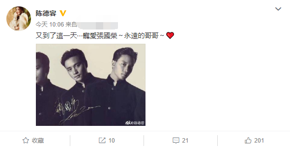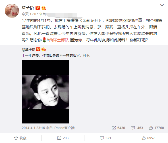 除了全球粉丝以各种方式悼念外,章子怡、袁咏仪、尹正、宁静、于晓光、钟楚曦、李艾、何晟铭、陈德容、任泉等数位圈内迷弟(迷妹)也发文缅怀张国荣。