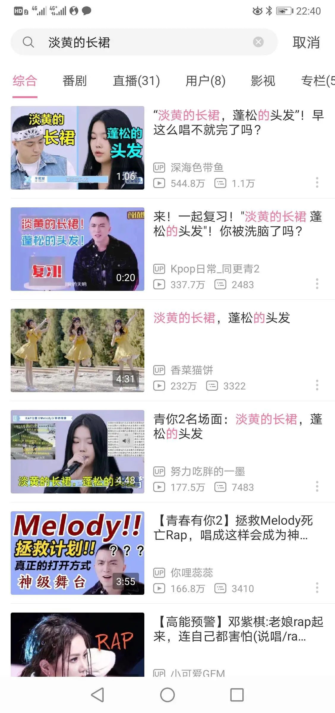 此外,在B站搜索“淡黄的长裙”,可以看到大量的视频出现,最高已有500万的播放量。结合B站的特点,这些视频中既有重新为《青你2》舞台原曲剪辑,加强节奏感的二次创作。也用利用《最炫民族风》等其他“神曲”配乐,搭配《Melody》说唱歌词的视频制作。其鬼畜效果也深受B站用户喜爱。