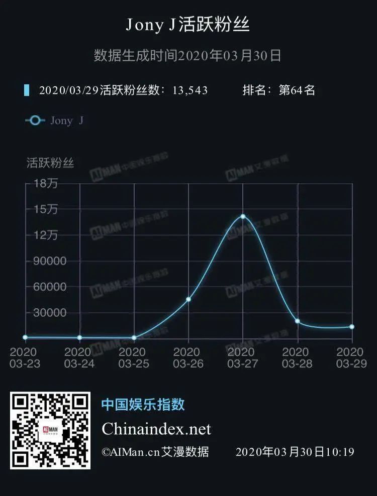 除了自带话题的秦牛正威之外,最无辜的JONY J这一次也“赚”足了眼球。根据艾漫数据显示,JONY J在当期节目播出后的第二天(3月27日),活跃粉丝数直线上涨。作为《青你2》导师阵容中存在感最低的一位,此次可谓是凭借职业滑铁卢而“逆风翻盘”。