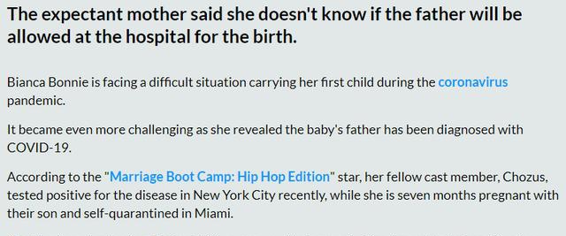 据外媒3月31日报道,美国28岁嘻哈女歌手比安卡·邦妮(Bianca Bonnie)面临困境,她现在怀孕29周超过七个月,但孩子的父亲Chozus却不幸确诊新冠肺