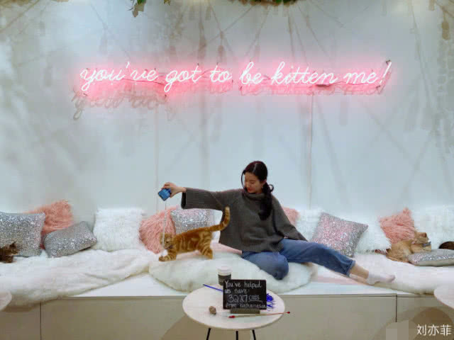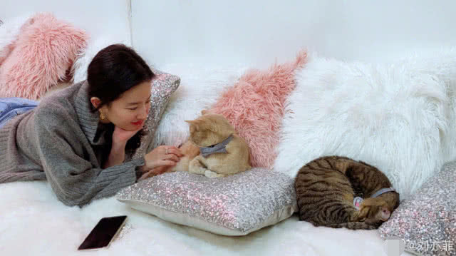 看来刘亦菲真的非常喜欢小动物,还很亲切的趴在沙发上与小猫玩耍。另一只猫咪似乎因为刘亦菲没有跟它玩,看起来很不高兴,将自己蜷缩在一旁暗自伤心。