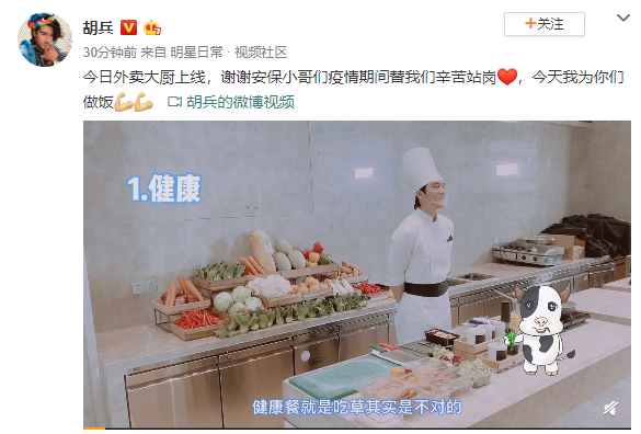 3月3日,胡兵变身大厨,分享了一段做健康餐的视频,并发文表示:“今日外卖大厨上线,谢谢安保小哥们疫情期间替我们辛苦站岗,今天我为你们做饭”。