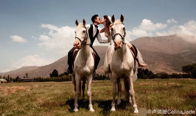 韩庚和卢靖姗去年年底在新西兰举行了浪漫的户外婚礼,二人骑着白马的婚纱照又酷又甜