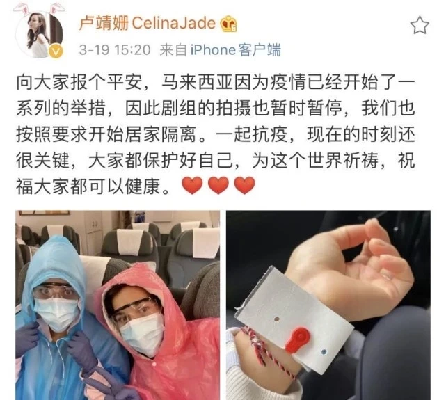 3月,正在马来西亚拍戏的卢靖姗在社交网向粉丝报平安。她表示由于疫情原因,剧组拍摄已暂停,演员们也按照要求开始居家隔离。