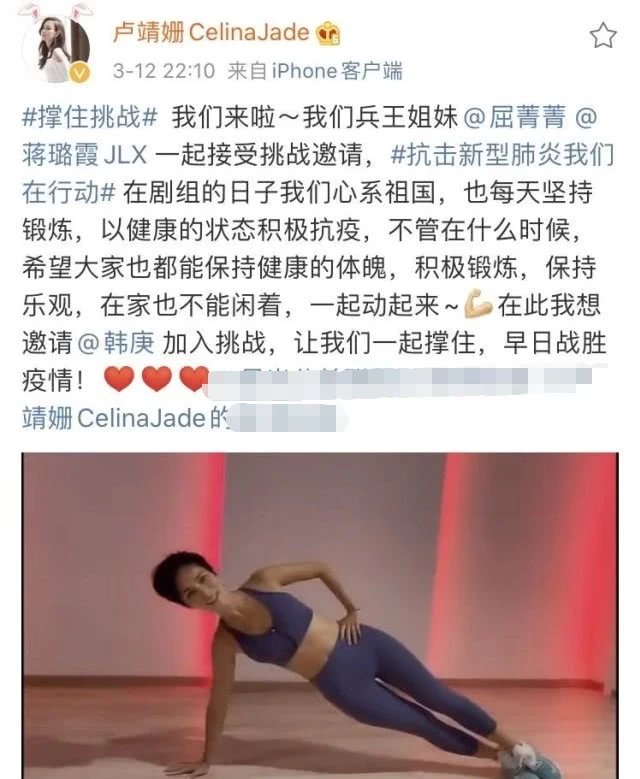 另外,卢靖姗一向是运动达人,在3月12日还上传过与剧组演员屈菁菁、蒋璐霞一起做运动的短片。