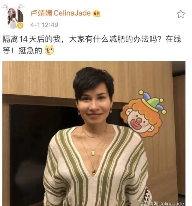 卢靖姗留言指这是自己隔离14天后的样子,着急在线等大家向她推荐减肥方法。