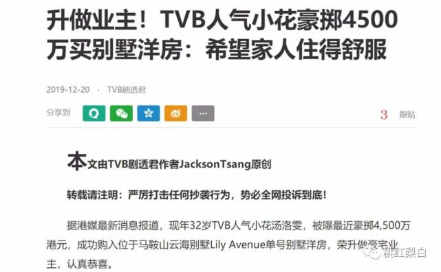 开工的单位就是TVB,往来的都是TVB明星,一个人串起了小半个TVB……这个模式让我想起了上周写过的“华谊小公主”王文也。(戳蓝字可以复习) 不同之处可能在于,汤洛雯从当模特儿走秀开始,就可以自食其力了,而且现在过得还挺不错。 有报道称,她去年还花4500万,买了位于马鞍山云海别墅Lily Avenue的2000多呎独立别墅,被外界称为“小富婆”。