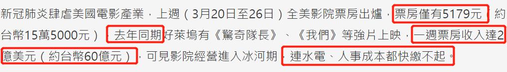4月2日,据台媒报道,好莱坞电影崩盘了,全美这一周票房从去年同时期的2亿美金跌至5000美金,预计疫情期间损失将高达180亿美金,影院经营达到冰河时期,引发热